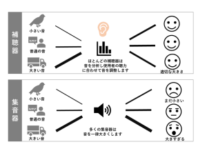 補聴器は聞こえに合わせて足りていない音を補います。集音器は一般的にすべての音を一律に大きくし、足りている音まで大きくしてしまいますので場合によっては耳にダメージが出ることもあります。